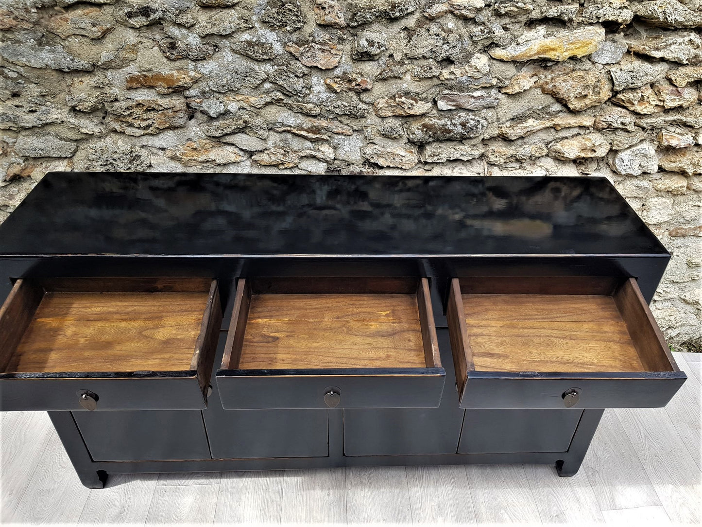 Ref: Y263 / Dimensions: W 155 x D 40 x H 91 cm / Weight: ~70kg / Age: 1930s / Material: solid elm wood , brass fittings / Handmade construction using mortise and tenon joints / Layout: three drawers and four doors, one removable shelf inside / Patina: black with a hand-lacquered finish applied by a specialist patina and lacquer artist.