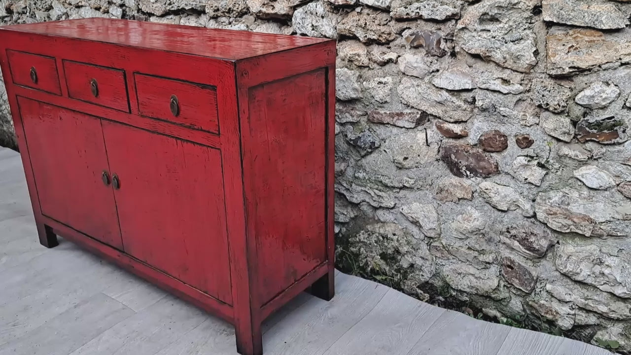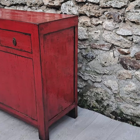 Ref: Y256 / Dimensions: W 130 x D 40 x H 90 cm / Weight: ~60kg / Age: 1930s / Features: three drawers, two doors and one removable shelf / Material: solid elm wood , brass fittings / Handmade construction using mortise and tenon joints / Patina: red with hand -lacquered finish by a specialist patina creator.