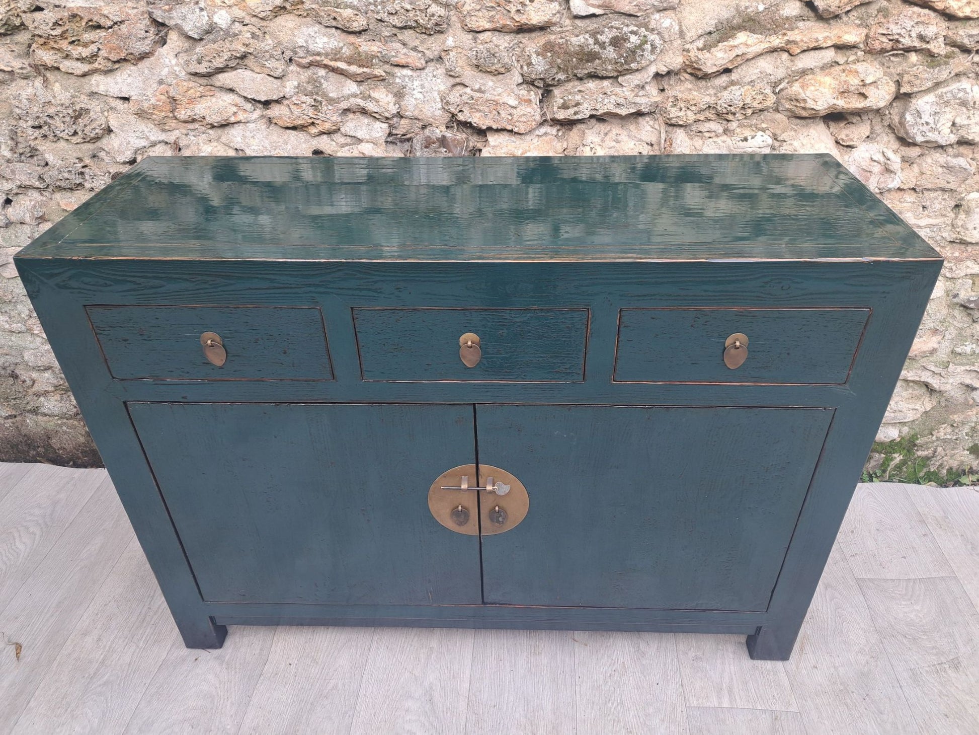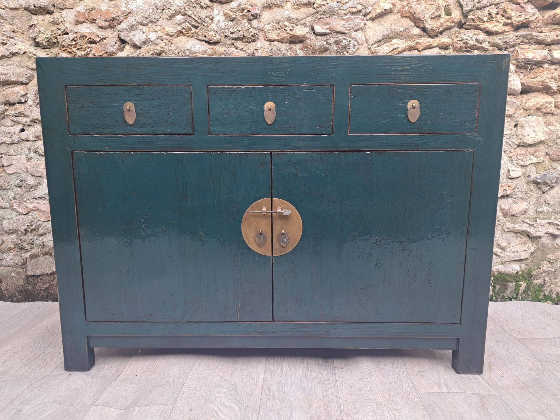 Rif: J348/ Dimensioni: L 117 x P 40 x H 85 cm/ Peso: ~40 kg/ Epoca: contemporaneo/ Distribuzione: tre cassetti e due ante, un ripiano rimovibile/ Realizzato a mano con incastri a mortasa e tenone/ Materiale: vecchio olmo massiccio , raccordi in ottone e un portachiavi in ottone fornito per chiudere le ante/ Patina: verde smeraldo e rifinito con diversi strati di lacca realizzati a mano da uno specialista in patinatura (potrebbero essere scattate altre foto all'arrivo del container).