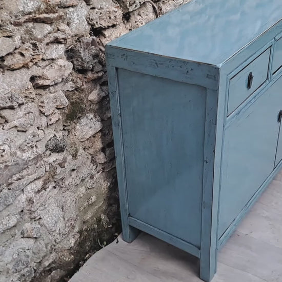 Outre son potentiel de rangement, ce buffet patiné bleu pastel de taille moyenne apportera clarté et fraîcheur à votre pièce.